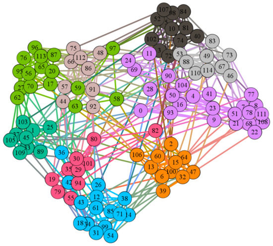 Figure 4 visualizes the community divisions in the Football network (EQ = 0.591), which is divided into nine different communities. The size of every community in the Football network is similar because the number of players on each football team is similarly limited. The results indicate that the algorithm can accurately identify the different communities in the network while considering the special attributes of every community.
