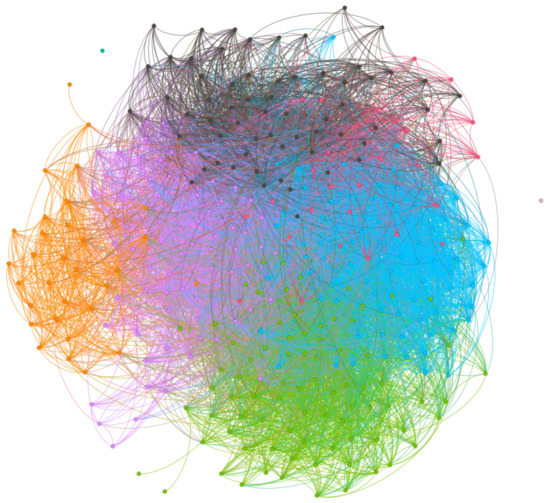 - Blondel, V.D.; Guillaume, J.L.; Lambiotte, R.; Lefebvre, E. Fast unfolding of communities in large networks. J. Stat. Mech. Theory Exp. 2008, 10, P10008. [Google Scholar] [CrossRef]
