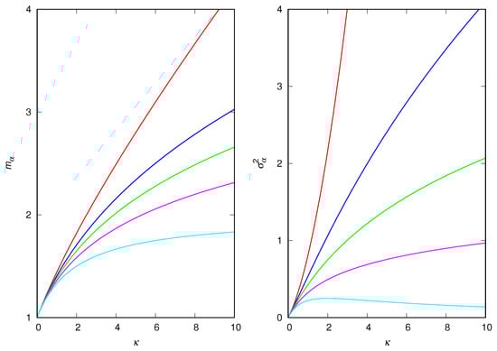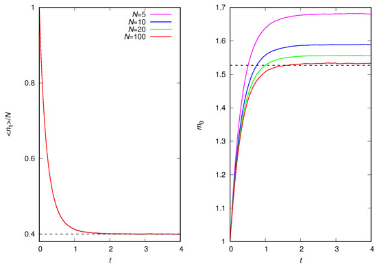 Figure 1 shows the time evolution of the mean density of isolates, , and the mean number of individuals per group for different values of the attractiveness exponent . At time , all N individuals are isolates (i.e., and ). Interestingly, although the mean density of isolates does not depend on in the equilibrium regime, as shown in Equation (11), the transient regime is affected by the attractiveness exponent: the increase in favors the production of isolates. This is so because hinders the formation of couples, which requires the annihilation of two isolates, whereas the formation of groups of size requires the annihilation of only one isolate. In addition, an increase in increases the transient period, as well as the mean size of the groups.