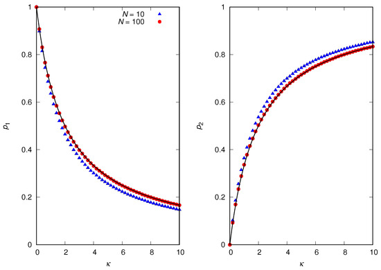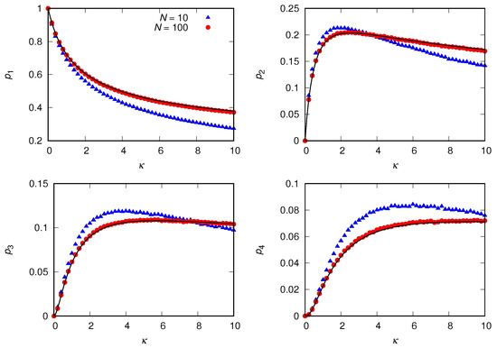 Interestingly, Figure 7 shows that this scenario—a single large group coexisting with isolates—describes the case very well for large N. Figure 8 corroborates this finding by showing that tends to a bimodal distribution characterized by sharp peaks at and in the limit of large N. In addition, this figure shows that (or ) is negligibly small for , in disagreement with the prediction (17) of the mean-field approximation.