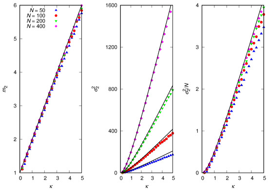 where . From this equation, we can easily obtain and . The reason that Equations (31) and (32) are only approximate and thus fail to fit the data for in Figure 5 is that, although we can calculate and exactly for all , we do not know how to calculate , which is the quantity measured in the simulations.