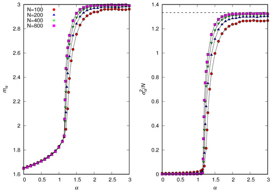 In order to better understand the transition between the equilibrium regime characterized by a finite variance and the regime where diverges linearly with N as , in Figure 9, we show the influence of the attractiveness exponent on and . The results indicate the existence of a discontinuous transition between these two regimes that takes place at a critical value . In addition, , so the regime of infinite variance but finite is not perfectly described by the scenario. In particular, for , we find . This estimate was obtained by considering population sizes up to and noticing that, for , the variance tends to a fixed value, whereas, for , it increases with N. As increases, we find that . We note that from the statistical physics perspective, the scaled variance is the order parameter of the casual-group model since it is zero for and nonzero otherwise.