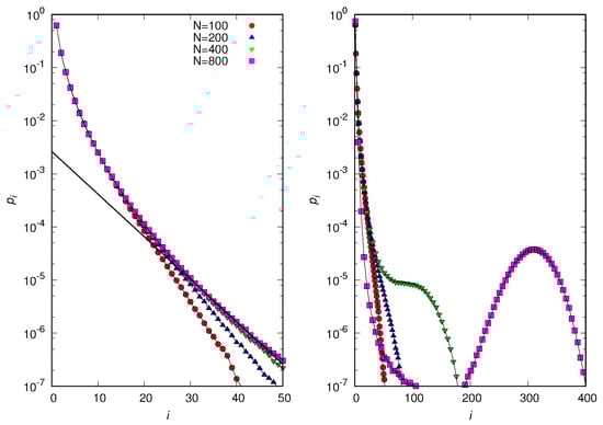 Figure 4 exhibits the comparison between the stochastic simulations and the logarithmic distribution (28) for and . As before, the results validate the use of the mean-field approximation if the number of individuals is not too small.