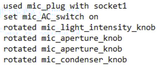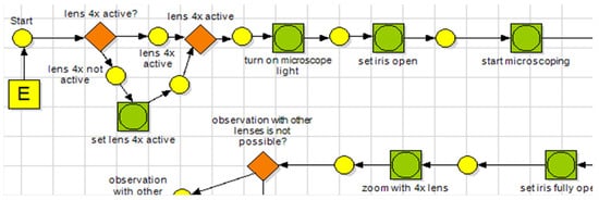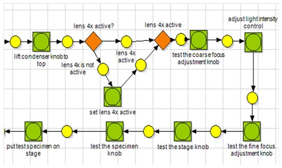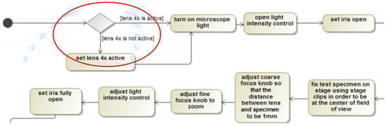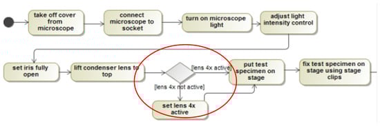 The above table shows the fitness calculation values for 11 different log files, with values ranging from 0.55 to 0.67. It is important to note that fitness calculation values are not the only measure of the effectiveness of a simulator in a specific educational setting. The fact that all students were able to complete the experiment successfully is a strong indication that the simulator can be effectively reused in secondary education, without additional preparation. However, it is also important to consider other factors, such as student engagement, learning outcomes, and satisfaction with the learning experience, to determine the overall effectiveness of a simulator in a particular educational setting. Most of the tasks in the process model for the HOU microscoping experiment were also observed in the logged events from the virtual laboratory application in secondary education. However, the order of some model tasks differed, indicating the need for some alignment. For instance, the decision node on whether the microscope lens 4x is active was in a different order between the model event for the secondary education experiment and the logged trace from the university experiment. Figure 7 and Figure 8 depict the differences between UML AD for secondary education experiment and the corresponding steps included in the log file from the HOU experiment’s execution.