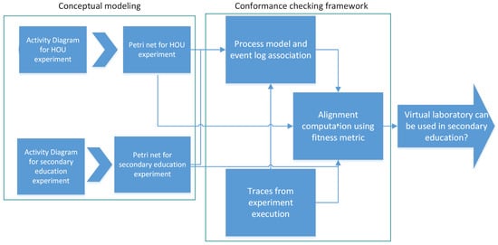 As the first step in our approach, we model experiments for both university and secondary education levels using UML activity diagrams (Ads) and the corresponding Petri nets. Afterwards, using Yasper tool, we validate, simulate and collect the simulation traces of the PN describing the experiment in one educational setting. In order to calculate the fitness metric, the experiment is performed in the Onlabs virtual laboratory in a different educational setting, and the ordered tasks are recorded in a log file. These traces are then used to compute the fitness between the model and the log. First, the tasks in the process model are associated with the logged events by using labels to denote the associated log event type for each task in the model. The mapping results are stored in an association database containing the associated model events and logged traces required for alignment computation. The mapping is then used for fitness calculation. The fitness results can help determine if the same virtual laboratory can be reused for the experiment in a different educational setting without further study.
