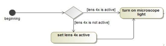 UML ADs are used to model the experimental procedure of microscoping for HOU and secondary education. In Figure 2 below, an AD is presentes depicting the initial steps of the experimental procedure of microscoping at the HOU level.