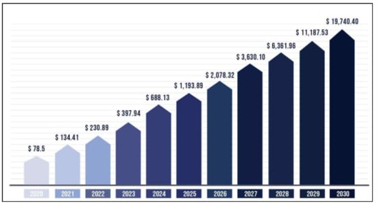 Encryption, Machine-to-Machine (M2M) data transfer, consensus, and distributed storage are basic aspects incorporated by the novel vision of Blockchain (BCT) technology. Several countries and international organizations have realized its potential usage. Moreover, many businesses are investing in BCT development [1]. Figure 1 shows the predictive rise of BCT in collaboration with the Internet of Things (IoT) market (Source: https://www.precedenceresearch.com/BCT-iot-market, accessed on 15 April 2023). Existing applications of BCT technology include digital asset trading and supply chain management. BCT has the potential to unleash a wave of innovation in service modes [2]. The IoT architecture tries to use BCT technology to address the security issue of data, allowing for user-directed interaction between all connected devices and the outside world [3]. Conspicuously, the current research proposes a decentralized and trustworthy IoT information-sharing security mechanism by incorporating BCT technology over conventional storage technologies [4]. There is currently no feasible method to secure the location data of IoT devices [5]. Global literature and use cases depict safeguarding location data on mobile devices. Location information protection via least squares estimate is suggested to address the ranging-based positioning security issue [6]. With the aforementioned approach, the precise position of each reference node is concealed, and only a fraction of computation is carried out [7]. Using the consolidated result of the reference node computation, the user makes an approximation on specific data location [8]. The approach may safeguard both the user’s and the reference node’s location data at the same time as the user is unable to deduce the precise position of the referencing node from intermediary computation information [9]. Due to the sensitive nature of location data, location services employ a double encryption method to safeguard their users’ private data [10]. This method encrypts the user interest points and the respective location at both the server and client. The service provider checks to see if the two sets of encrypted data match [11]. Although both approaches provide useful location data, their use is limited since that data cannot be utilized to power regular services [12].