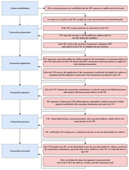 Being a decentralized, immutable, traceable, and efficient means of bill production and trustworthy billing support for transaction payment activities and behavior records across various nodes of the IoT, the trade BCT is a key component. The system can account in two ways (the procedure is shown in Table 5), either by exchanging the competition for multi-dimensional information like computing power and reputation for billing rights, or by introducing tokens or various types of digital currency with the effect of legal currency as a medium for value exchange. The strategy promotes the intelligent node’s intrinsic growth, or “the capacity to perform more work.” To ensure that every node in the network gets a chance to save a copy of the bill, it is necessary to broadcast transaction data for both billing systems to the whole system. IoT nodes may function as either a CSC or a CSP. There are two main issues with BCT technology: the use of public ledgers to record transactions poses a potential privacy breach, and the generation of a block in the BCT technology and waiting for the least number of blocks to confirm the payment is valid, which brings about the problem of long transaction time. The IP address and transaction topology on the BCT may provide information about a user’s identity, but an attacker cannot determine the user’s true identity with just the public key account. To reduce transaction confirmation times while simultaneously increasing system security and to set up a coin center with a trusted public key address as the real payment, this research provides an enhanced technique based on a partial blind signature process that uses cloud service. A one-time public key address and a blind signature method are used to record transactions with increased secrecy. The creator of a tag must be acknowledged as part of the tag’s authority before the two tags may engage in any kind of interaction. Submit an authorization request to the organization, and after it receives the reader’s request, the company will evaluate its trustworthiness based on the following criteria: