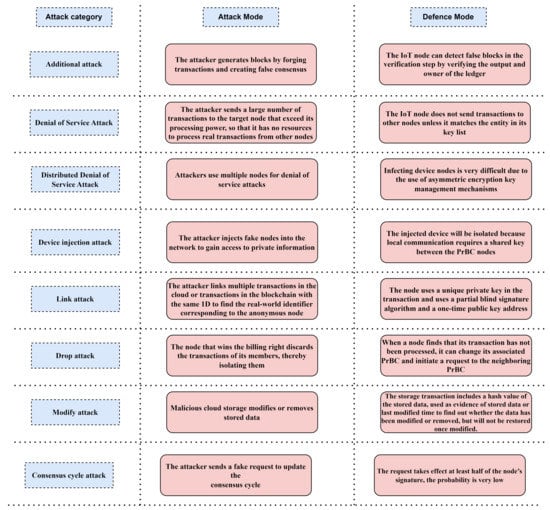 In this section, the security of the proposed BCT-based security architecture is assessed for IoT data exchange. Figure 7 details the distinct attacks on the IoT/BCT for risk assessment. The current study incorporats sufficient attack types that can lead to vulnerability in IoT security. Moreover, the completeness of the list can be justified in a manner that the included attacks vary from IoT node level to the storage level. Therefore, the proposed technique can compressively secure data in the IoT network. The effectiveness of the framework’s defenses against different threats is defined by analytical criteria. It can be seen from Figure 7 that the framework is very secure against five attacks, very secure against three, and somewhat secure against one. The reasoning behind the analysis is that it is impossible to tell an attacking node apart from a normal node if it follows the process of registering the network and assigning public and private keys. This is the case unless the attacking node has additional attack behavior and the normal node has access to the private chain. There will be far less of a chance of it happening. This study lays the groundwork for the IoT by allowing nodes to communicate their feedback histories via various private chains (Private Block, chain, PrBCT).