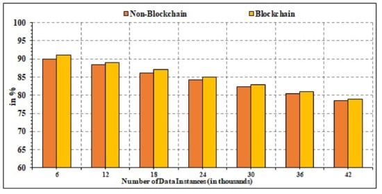 In addition to the aforementioned aspects, reliability is computed. Effectiveness requires the ability to make decisions. This necessitates evaluating how well reliability analysis is working going forward. It depicts the percentage of data attacks correctly detected by the proposed model as compared to the non-blockchain technique. The simulated results of the dependability evaluation may be shown in Figure 11. As more data sets are used in the experimental implementation of the offered model, higher efficiency values are recorded, nearing 93.67%. For extensive data sets, the proposed method seems to perform better.