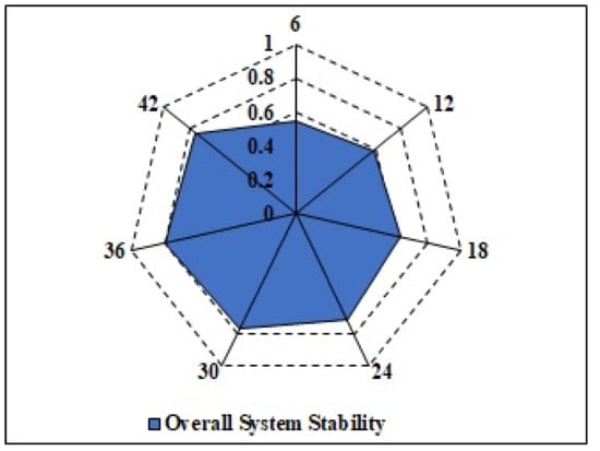 Stability analysis is used to determine the durability of the proposed model over large data instances. In other words, the system’s stability foretells general stabilization when it is deployed across large data sets for long-term assessment. Mean Absolute Shift is used to evaluate system stability. A MAS score of 0 indicates the least stable condition possible, and a MAS score of 1 indicates the most stable condition possible. The stability analysis of the proposed system is shown in Figure 12. It has been calculated that the proposed model has an overall range from 0.65 to 0.81, with an average of 0.62. The proposed method is robust and well-suited for detection.
