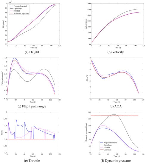 For the open-loop control scenario, the tracking performance is far from satisfactory. Moreover, the maximum dynamic pressure violates the constraint, which will cause damage to the vehicle. As for the comparison T-MPSP method, the terminal accuracy is acceptable, while the overall tracking performance is not so good. In the proposed method, the terminal deviations are much smaller than in the comparison law, which confirms the effectiveness and superiority of the proposed method. The optimization process of the proposed method and the T-MPSP method requires about 1.7 s on our laptop with an AMD 1.8 GHz CPU. However, it needs about 2.8 s for the MPSP tracking method.