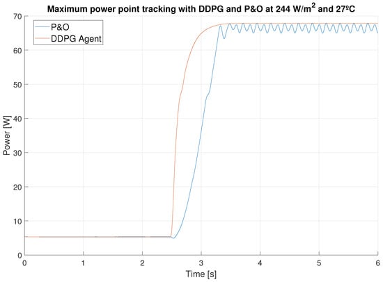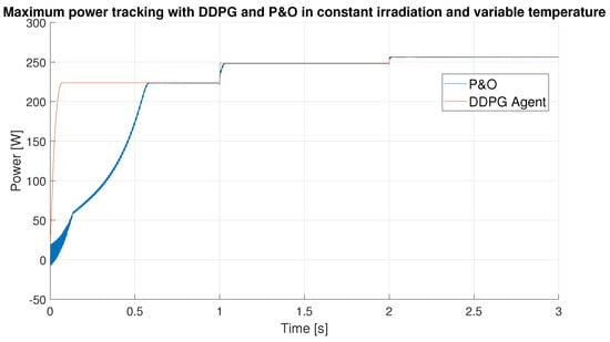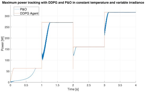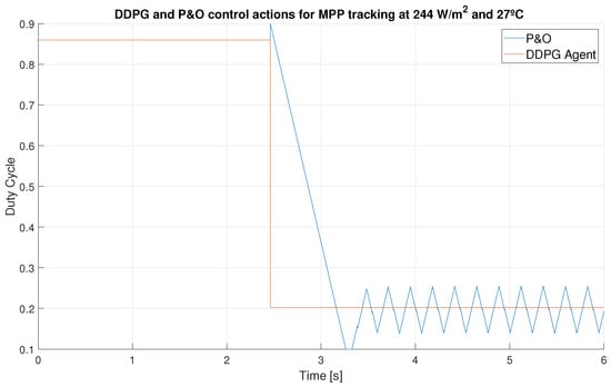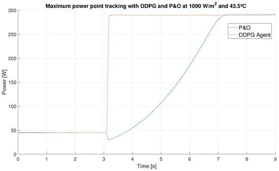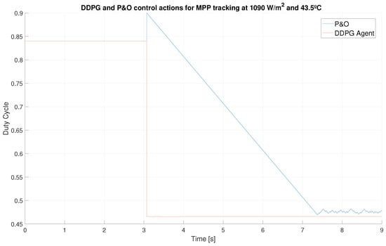 - Instantaneous control action. Contrary to the work [35], after training, the DDPG agent instantly provides the optimal duty cycle to obtain the MPP, so the time needed to reach the MPP is only limited by the response of the system.