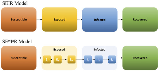 In this work, we use the so-called “Erlang model,” shown in Figure 1, which divides the E and I classes into m and n sub-classes, respectively. Since all m latent sub-classes are identical, as are all n infectious sub-classes, we will denote the Erlang model as .
