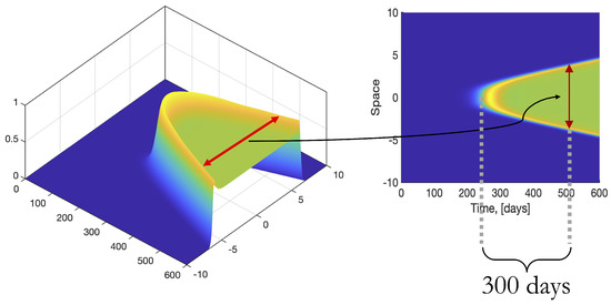 Figure 2 shows a typical three-dimensional view of the distribution of infectious individuals as a function of both time and space, as well as its projection onto the time-space plane. In addition, to compare the effects of different parameters in the evolution dynamics, we introduce a separation metric. This metric captures the spatial separation of the peaks in the number of infectious individuals at a given time, represented by a red arrow in Figure 2. For consistency, we calculate this metric after 300 time steps from the time when the number of infectious individuals, at the middle of the spatial domain, reaches 1% of the total number of individuals.