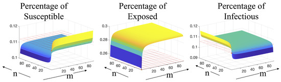Figure 3 shows the dependence of the equilibrium points on the number of sub-classes within the exposed and infectious classes. Grid planes show the equilibrium solution for , in this case the system reduces to the well-known model, whose endemic equilibrium point is found as [37],