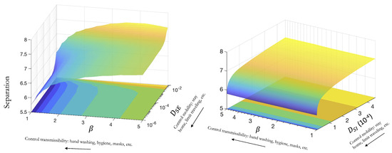 (Left) Effects of changing the cross-diffusion coefficient between susceptible and exposed and the transmission parameter on the change in separation. (Right) Effects of changing the cross-diffusion coefficient between susceptible and infectious and the transmission parameter on the change in separation. Lower and result in a reduced spatial spread: the separation between peaks is the smallest (blue regions), while large cross-diffusion coefficients and transmission parameters result in a larger spread (yellow regions).