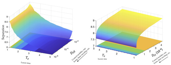 As discussed in the introduction, our goal is to investigate the effects of cross-diffusion on epidemic dynamics. In particular, we are interested in discerning the effects of the cross-diffusion coefficients and . That is, we investigate the impact of having susceptible individuals moving away from high concentrations of individuals that have been exposed and might or might not be infectious. For comparison, recall that we use a separation metric defined in Figure 2. In Figure 5, Figure 6 and Figure 7, this metric is plotted in the z-axis as a function of different model parameters.