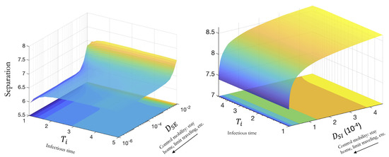 (Left): Effects of changing cross = diffusion coefficient and infectious time on the change in separation. (Right): Effects of changing cross-diffusion coefficient and infectious time on the change in separation. Lower separation corresponds to lower spread (blue regions), and higher separation to higher spread (yellow regions).