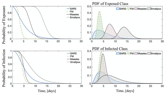 Figure 8 shows the distribution functions and probabilities for the four diseases considered in this study. Smallpox has the longest latent period and this is expressed in the fact that the probability of being exposed remains high for much longer than in other diseases. Similarly, although Measles has the lowest reproductive number, the fact that its latent period is long results in a ‘longer’ probability of being exposed and/or infectious than other diseases with larger . FM shows a fast peak for both exposure and infection, meaning this is a highly contagious disease but relatively short-lasting. Finally, SARS is not only highly transmittable, given by the number, but has the ability to ‘linger’ as shown by the temporal evolution of both the probability of exposure and infection.
