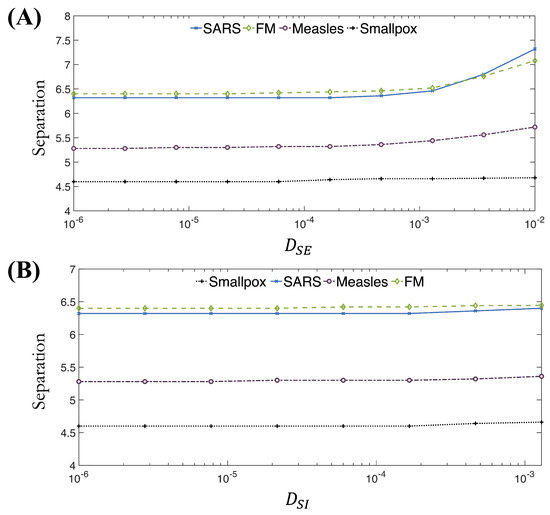 Figure 9 shows the separation metric as a function of and for the four diseases investigated in this section. Using the separation as a metric of spatial spreading, it can be seen that spreading monotonically increases as the cross-diffusion coefficients increase. However, both the magnitude and the rate of the increase vary from disease to disease. Finally, the effect of is stronger than that of .