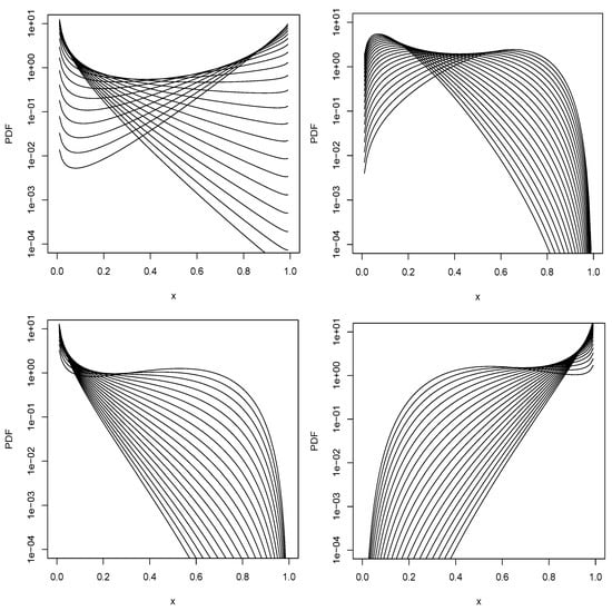 Shapes of (1) for , and (top left); , , and (top right); , , and (bottom left); , , and (bottom right). The curves from the top to bottom on the right hand side of each plot correspond to .