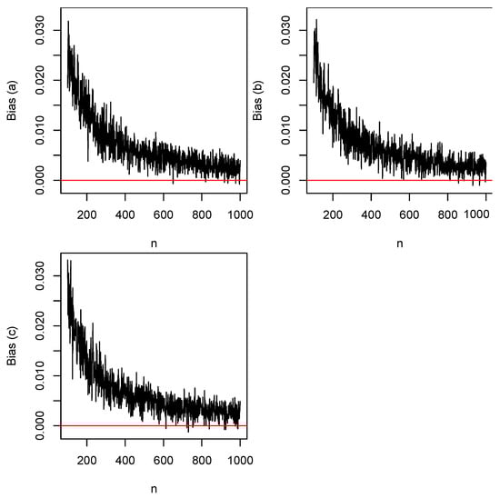 We took the initial values as , , and . Plots of the biases versus n are shown in Figure 2. The horizontal lines in this figure correspond to the biases being zero. Plots of the mean squared errors versus n are shown in Figure 3. Plots of the coverage probabilities versus n are shown in Figure 4. The horizontal lines in this figure correspond to the coverage probabilities being equal to 0.95. Plots of the coverage lengths versus n are shown in Figure 5.