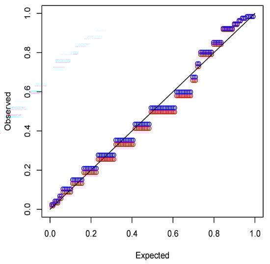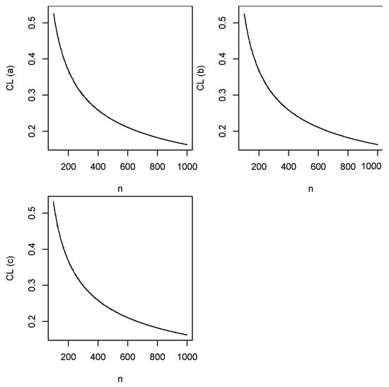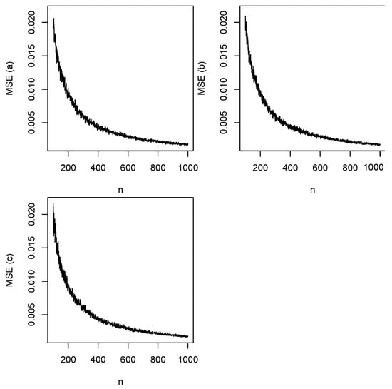 The maximum likelihood estimates of a, b, and c, say , , and , are the simultaneous solutions of , , and . In Section 11 and Section 12, we obtained the maximum likelihood estimates by directly maximizing (12). A quasi-Newton algorithm was used for maximization; see the optim function in the R software [14] for details of the algorithm.