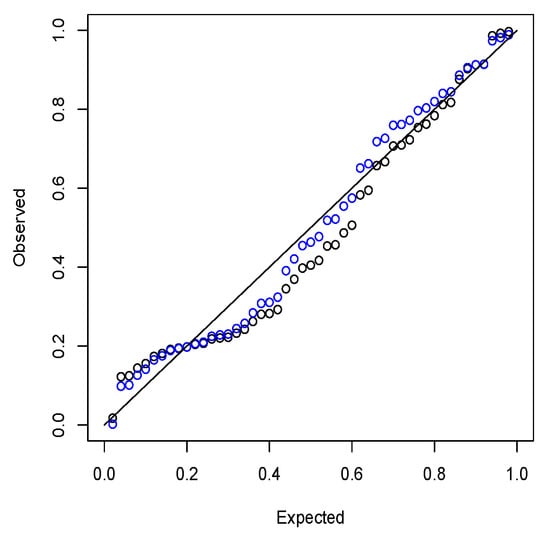 The better fit of (1) is confirmed by the probability plots shown in Figure 6. The plotted points for (1) are closer to the diagonal line. The sum of the absolute deviations between the expected and observed probabilities for the fit of the standard beta distribution is 2.455. The same for the fit of (1) is 1.857.