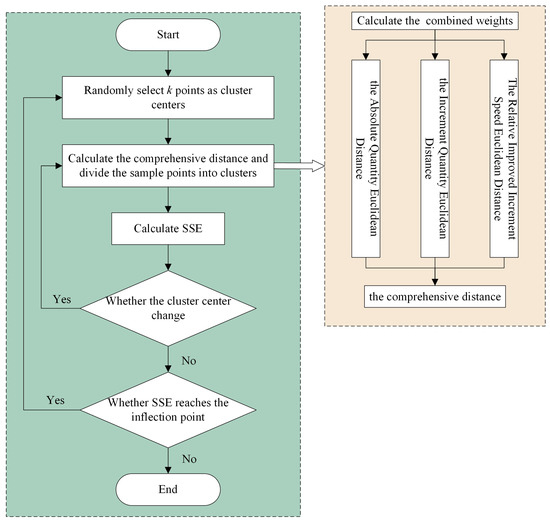 The k-means method is introduced into the clustering analysis in response to the question of which criterion to use to determine the degree of similarity between deformation regions. The k-means method is a classical unsupervised machine learning algorithm that clusters samples based on their distances to K clustering centers μk. Each partition is set as ck (k = 1, 2, …, K) [36]. The algorithm is used widely due to its computational simplicity and high efficiency. Based on the similarity measurement criteria proposed above, the calculation steps are as follows [37]: