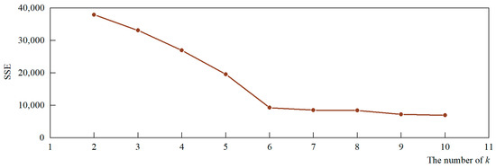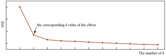 where k is the number of clusters; ck represents the number of k clusters; and yμ is the average value of the monitoring deformation data yit. The basic idea of the elbow method when determining the optimal number of clusters is that as the number of clusters k increases, sample grouping becomes more refined, the degree of aggregation of each cluster gradually increases and the SSE gradually decreases. When k is less than the true number of clusters, the degree of aggregation of each cluster increases significantly due to the increase in k, thus the SSE decreases significantly. When k reaches the true number of clusters, the return on the degree of aggregation obtained by increasing k decreases rapidly, thus the decline in SSE decreases sharply and then flattens as the value of k continues to increase, that is, the graph of SSE and k is elbow-shaped and the corresponding k value of the elbow is the true clustering number of the data. Figure 4 shows the selection process for parameter k using the elbow method.