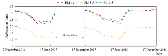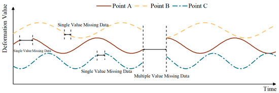 In actual engineering, there are generally two cases of missing data in concrete dam deformation monitoring, as shown in Figure 6: one is that data for one measurement point are missing in a certain time period—this is called single-value missing data—and the other is that data for all measurement points are missing in a certain time period—this is called multiple-value missing data. In both cases, the missing data can be imputed using the methods proposed in this paper. The imputation steps are as follows: