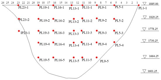 Jinping-Ⅰ dam, the highest concrete hyperbolic arch dam in the world, is taken as an example to verify the feasibility of the novel missing data imputation model. The top elevation of the dam is 1885.0 m, the lowest base elevation is 1580.0 m and the maximum dam height is 305.0 m. It is located on the main stream of the Yalong River in Liangshan Yi Autonomous Prefecture, Sichuan Province. The construction project started in 2005 and the pouring of the first concrete for the dam body commenced on 23 October 2009. Pouring of the concrete reached the dam crest elevation on 23 December 2013. Water was first added to a normal pool level of 1880 m on 24 August 2014. Several horizontal plumbs are installed in the dam to fully monitor the deformation of the structure. The exact distribution of the deformation measurement points is shown in Figure 8.