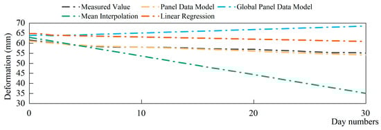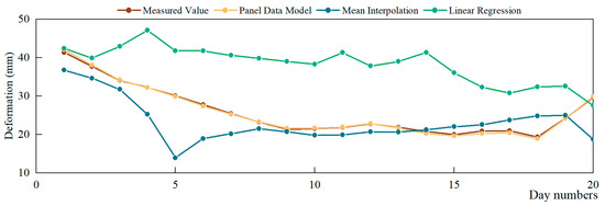 To verify the generalizability of the proposed imputation model, we took the measurement points in another region as a second example and assumed that all measured values (PL11-5, PL13-5 and PL16-5) in Cluster 6 from 13 July 2017 to 13 December 2017 were missing, as plotted in Figure 14. The data before and after the missing data were used to build the panel data imputation model. Comparison of the fixed effects panel data model and the random effects panel data model for Cluster 6 is shown in Figure 15. The fixed effects model and the random effects model were established and gave the same result. The parameters of the panel data model are given in Table 4. To verify that zoning the measurement points can improve the accuracy of imputation of deformation data, a global panel data model, a mean imputation model and a linear regression imputation model were compared. The imputation results of measurement points in Cluster 6 are shown in Figure 16, Figure 17 and Figure 18. At the same time, the average values of the Root Mean Square Error (RMSE) and the Mean Absolute Error (MAE) of the three measurement points were calculated to compare accuracy. The formula for calculating RMSE and MAE values for each measurement point can be expressed as: