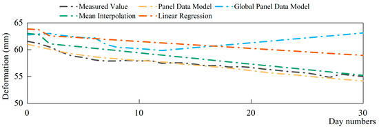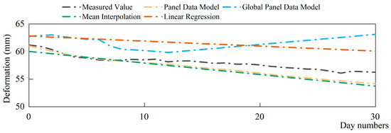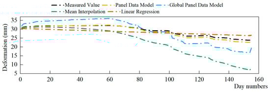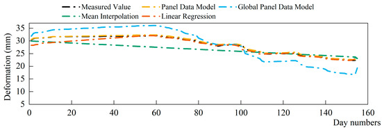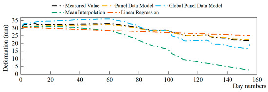 From the comparison of the imputation results of each model, it can be concluded that the panel data model proposed in this paper imputes missing data relatively well. At the same time, the mean RMSE and MAE values are both relatively small. The panel data model transforms the traditional point analysis method, which can, to a greater extent, avoid the bias caused by considering only local deformation of the concrete dam. The random effects panel model for imputation of missing data has high flexibility and sensitivity that can overcome interference from random disturbances, abnormal fluctuations and covariance effects. Thus, it can more objectively portray the basic law of dam deformation.