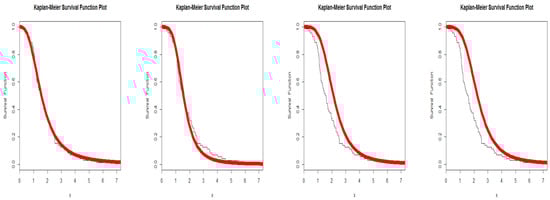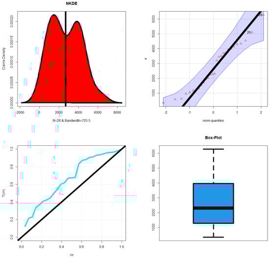 The nonparametric density estimation (NKDE) method for examining the initial shape of the insurance claims density, the Q-Q graph for examining the “normality” of the current data, the TTT graph for examining the initial shape of the HRF, and the “box graph” for identifying the extreme claims are just a few of the additional graphical methods that are taken into consideration (see Figure 11, bottom right graph). The top left graph of Figure 11 shows the initial density as an asymmetric function with a left tail. No extreme values are shown from Figure 11 (bottom right graph).
