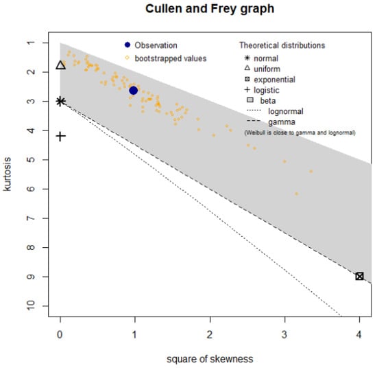 We start by examining the data on insurance claims statistics, but this time for data on insurance claims. It is possible to quantitatively, visually, or by combining the two, evaluate real-world data. Initial fits of theoretical distributions such as the normal, exponential, logistic, beta, uniform, lognormal, and Weibull are assessed using the numerical technique (see Table 11), as well as other several graphical/statistical tools, such as the skewness-kurtosis graph (or the Cullen-Frey graph) (see Figure 10).