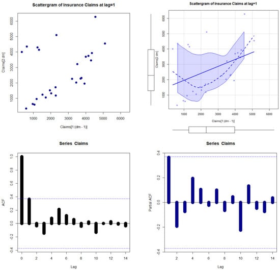 The first row in Figure 12 shows scattergrams for the data on insurance claims, while the second row shows the autocorrelation function (ACF) and partial autocorrelation function (partial ACF). We provide the ACF that may be used. Figure 12 illustrates the distribution of hills and valleys on the surface with Lag = k = 1 in more detail (bottom left). Theoretical partial ACF with Lag = k = 1 is shown in Figure 12 (the bottom right panel). According to the bottom right corner of Figure 12, the initial lag value is statistically significant; however, none of the other partial autocorrelations for any other delays are. In order to potentially fit these data, an autoregressive (AR(1)) model is suggested.