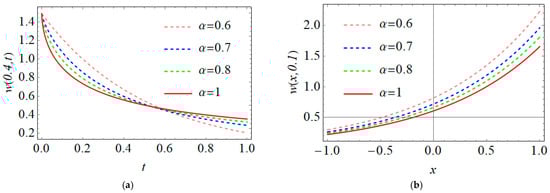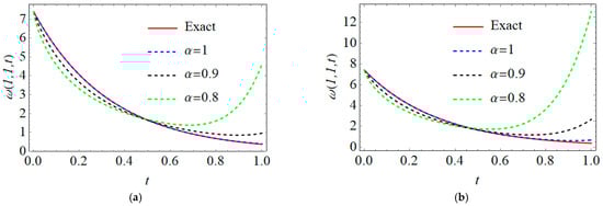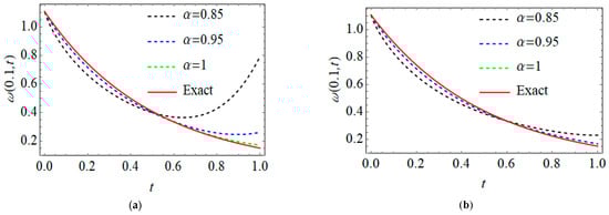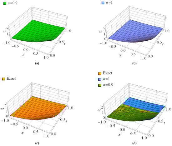 Next, Table 1 illustrates some numerical simulations of the exact, 8th-MFS-AS and absolute errors , when for time-FHTEs (32) and (33) at the standard-order of for various values of and . Some graphical representations are achieved for the Laplace FPSM outcomes, and the exact solutions of the considered problems (32) and (33) are shown in Figure 1 and Figure 2. Figure 1 displays the geometric behavior of the 8th-MFS-AS at some values of against the exact solution, whereas Figure 2 illustrates the effect of the fractional-order derivative on the behavior of the 8th-MFS-AS at different values of parameter in a 3D-graph with a space-time domain .