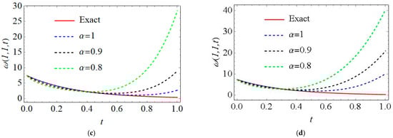The geometric behaviour of the exact and th-MFS-ASs for IVPs (55), (56) at various values of fractional-order : (a) , (b) , (c) and (d) .