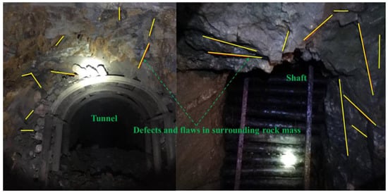 Underground surrounding rock mass of tunnel and shaft containing defects (or flaws) at various angles.