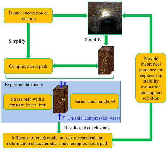 The above literature review shows that the current studies on cracked rocks are mostly concentrated on a very simple stress path with monotonic loading or cyclic loading. The surrounding rocks are normally subjected to repeated disturbance with various amplitudes due to excavation and mining activities [], causing the stress path to be more complicated. Importantly, our recent achievements revealed the energy characteristics and propagation laws of microcracks in fissured rock under complex stress paths [,]. However, the influence of the crack angle on the deformation and failure characteristics of fissured rock under stepped cyclic loading was not investigated (Figure 2). In this paper, we innovatively considered the excavation disturbance of the cracked rock mass as the discontinuous periodic cyclic loading with different amplitudes. Based on this, the mechanical and deformation characteristics of rocks with single cracks of different angles under stepped cyclic uniaxial compression were investigated. The related results provided evidence and guidance for the evaluation of the engineering stability and the selection of the support methods.
