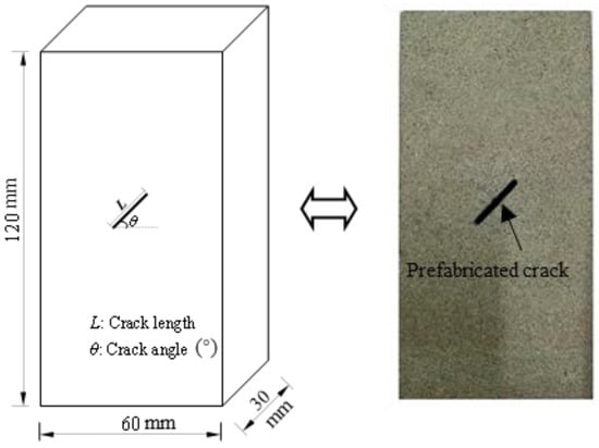 Sandstone is a kind of sedimentary rock and is commonly used in laboratory testing [,]. The sandstone specimens used in the experiment were prepared at the Laboratory of Coal Mine Disaster Dynamics and Control, Chongqing University, Chongqing city, China. The sandstone was first processed into cubes with dimensions of 30 mm × 60 mm × 120 mm, according to the aspect ratio standards (2.0~2.5) suggested by the International Society for Rock Mechanics. Afterwards, a single crack was cut through the center of the specimens, as shown in Figure 3. The specimen numbers and the geometric parameters of the cracks contained in the rock specimens are listed in Table 1. The length errors of all the specimens were less than 0.3 mm and the unevenness of both end faces after polishing was less than 0.02 mm. The end face was perpendicular to the axis, with a maximum deviation of less than 0.25°. To minimize the influence of the specimen inhomogeneity on the test results, all the specimens were taken from the same rock block.