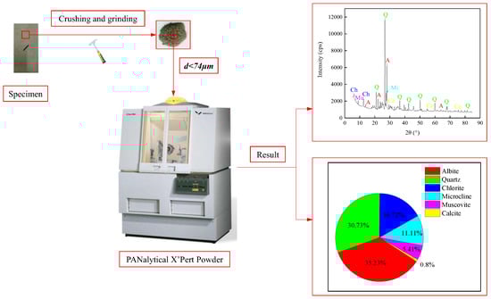 In addition, to determine the mineral composition of the tested sandstone, X-ray diffraction (XRD) tests were performed on the sandstone specimens using the PANalyticalX’Pert powder from the Analytical and Testing Center at Chongqing University, Chongqing city, China. The related test procedure and results are shown in Figure 4. From the XRD test results, the minerals contained in the sandstone were mainly quartz (30.73%), microcline (11.11%), chlorite (16.72%), albite (35.23%), muscovite (5.41%), and a small amount of calcite (0.8%).