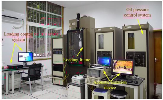 The MTS815 test system, manufactured by the State Key Laboratory of Coal Mine Disaster Dynamics and Control at Chongqing University, Chongqing city, China, was used in the experiment. The uniaxial cyclic loading and unloading tests on the rock materials was applied by the test machine. The test system had a high accuracy and stable performance and consisted of a control module, a loading and unloading module, and a data acquisition module. Additionally, the test system applied a maximum axial load of 2800 kN to the rock specimens. The MTS815 test system is shown in Figure 5 [].