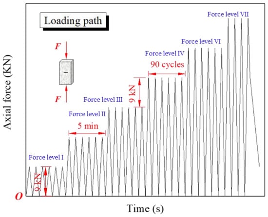In the experiment, the rock specimens were compressed using a force control. As shown in Figure 6, the maximum force level at the first loading step was 9 kN. The upper limit of the applied force at the following force levels was progressively increased by 9 kN, whereas the lower force limit remained unchanged (0 kN) at all the force levels. The rock specimens suffered from 90 loading and unloading cycles at each force level, with a frequency of 0.3 Hz lasting for 5 min. All the tested rock specimens were compressed according to the designed loading path until the rock specimens were destroyed.
