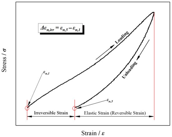 where Δεn,irr and n refer to the incremental irreversible strain recorded in the nth loading and unloading cycle and the serial number of the cycle, respectively; and εn,3 and εn,1 refer to the strains recorded at the end and first points of the nth cycle, respectively. Therefore, through the accumulation, the irreversible strain can be obtained as the following.