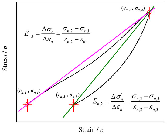 The meanings of the symbols in Figure 8 are as follows: n denotes the serial number of the current cycle, and En,1 and En,2 represent the loading elastic modulus and the unloading elastic modulus in the nth cycle, respectively. Furthermore, Δσn and Δεn refer to the stress and strain differences between the loading peak point n2 (εn,2, σn,2) and the loading initial point n1 (εn,1, σn,1), respectively; and Δσn′, Δεn′ refer to the stress and strain differences between the loading peak point n2 (εn,2, σn,2) and the unloading end point n3 (εn,3, σn,3), respectively.
