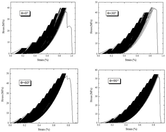 Based on the data collected by the MTS815 rock mechanics test system, the stress–strain curves were obtained, as shown in Figure 9. For the stepped cyclic loading, the stress–strain curves of the cracked specimens with different crack angles all showed a “stepped” growth trend. By comparing the stress–strain curves of the different rock specimens, it was found that the larger the crack angle, the more the cyclic gradients were experienced by the specimen, and the greater the peak stress of the rock specimens. The test results of the rock specimens are summarized in Table 2. It can also be noted from Table 2 that the failure strain tended to decrease with the increasing crack angle. The increasing failure stress and decreasing failure strain indicate that the rock specimens underwent a more brittle failure as the crack angle increased. The reason may be that as the crack angle increases, the effective cross-sectional area of the crack decreases, resulting in a reduced effect on the rock failure stress. Due to the stress concentration at the tip of the crack, an increasing crack angle (decreasing effective cross-sectional area) also resulted in a higher stress level and a lower overall deformation, and thus, increased the rock brittleness. In terms of practical application in rock engineering, the advantage of a higher failure stress allows for a greater load-bearing capacity and stability of the rock structures. However, the disadvantage of a more brittle failure is that it can lead to sudden and catastrophic failure without warning, which can be dangerous in certain applications. Therefore, the support designs that can withstand higher failure stresses and effectively mitigate the risk of brittle failure are desired.
