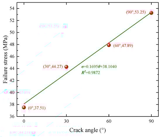 From the stress–strain curves in the stepped cyclic loading tests, the crack angle showed a significant influence on the peak (failure) stress of the rock specimens. The quantitative relationship between the peak stress of the rock specimens and the crack angle is shown in Figure 10. There was a remarkable linear relationship between the peak stress and the crack angle of the rock specimens. That is, as the crack angle increased, the peak stress of the specimens increased linearly with a coefficient of determination of 0.9872. This showed that the crack angle had a significant influence on the rock strength. Therefore, in some geotechnical engineering tasks, it is necessary to ensure that the primary cracks in the rocks are vertical in order to increase their bearing capacity.